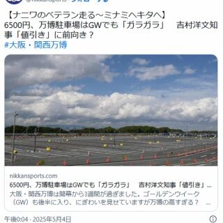 @himahima195ご注意を。 6500円、万博駐車場はGWでも「ガラガラ」 吉村洋文知事「値引き」に前向き?(日刊スポーツ) #Yahooニュース news.yahoo.co.jp/articles/fdc25…