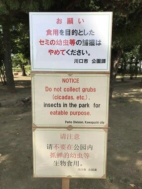@no_ime_zi中国語なども併記 食うな! セミの幼虫「採取禁止」の張り紙 都内の公園、食用目的で乱獲か 中国語でも注意喚起 公園のセミ幼虫 食用目的で乱獲か #Yahooニュース news.yahoo.co.jp/pickup/6545507
