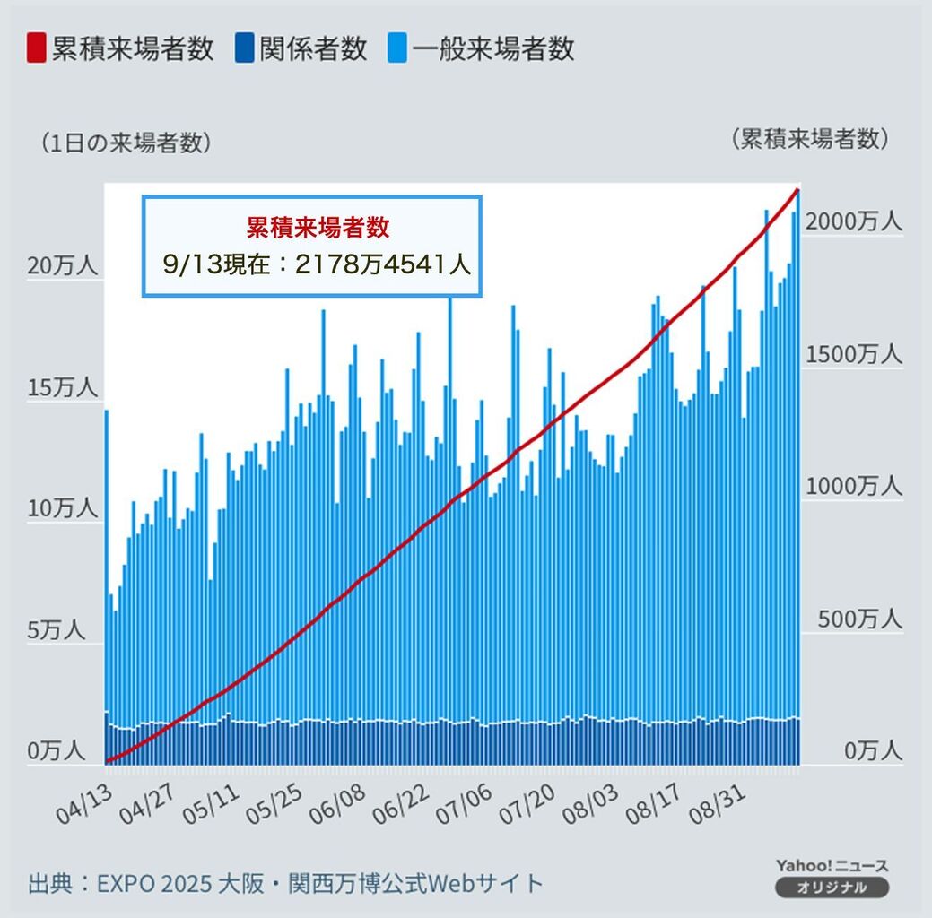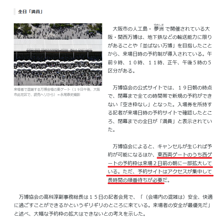 | 万博入場券は払い戻しなし、閉幕まで予約満杯…未使用券は140万枚超えか 大阪・関西万博を運営する日本国際博覧会協会(万博協会)は19日、閉幕(10月13日)までの来場予約枠について、全ての時間帯が埋まったことを明らかに… (出典:読売新聞オンライン) |