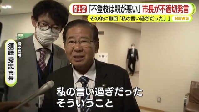 | 不登校は「親が悪い」発言の富士宮市長が議会で謝罪 「短絡的に述べたことが多くの人を傷つけた」 発言の真意は「学校だけが悪いのではないということ。不登校は様々な要因によるものということは承知している」 …と発言した静岡県富士宮市の須藤秀忠 市長は12月5日、「短絡的に述べたことが多くの人を傷つけた」と謝罪しました。 富士宮市の須藤秀忠 市長は12月2日… (出典:テレビ静岡NEWS) |