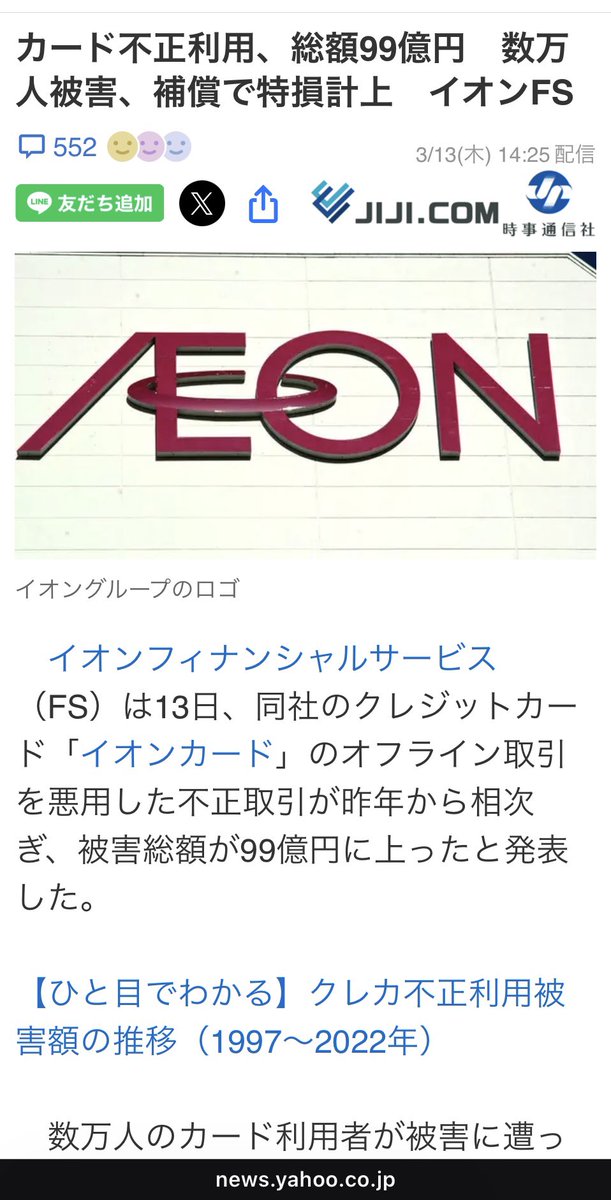 @wishstar_Hopeイオンフィナンシャルサービス(FS) クレジットカード「イオンカード」のオフライン取引を悪用した不正取引 【時事ドットコム】2025年03月13日22時29分 カード不正利用、総額99億円 数万人被害、 補償で特損計上―イオンFS jiji.com/jc/article?k=2…