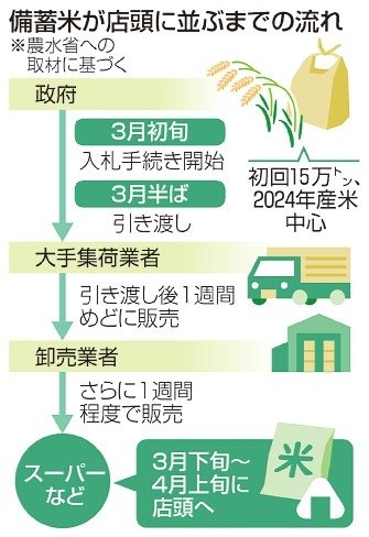 | 政府備蓄米の放出開始、価格注目 倉庫から搬出、下旬にも店頭へ 政府は18日、入札で落札された備蓄米を大手集荷業者の全国農業協同組合連合会(JA全農)に引き渡し、放出を始めた。JA全農は同日中に埼玉県内の保管倉… (出典:共同通信) |
